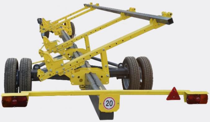 Le principal avantage de la remorque "Carrello 2 Axes" est sa polyvalence et sa grande maniabilité. Cela est possible grâce à divers réglages du support pour que le râteau de la tête de coupe, qui est monté sur le châssis, puisse s'asseoir correctement. Ces ajustements permettent à la remorque d'être correctement alignée avec les raidisseurs de l'épandeur.