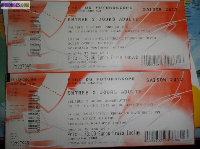 Nous avons reçu pour notre anniversaire ces 2 billets pour le futuroscope, entrée 2 jours consécutifs, spectacle nocturne inclus, pour adultes, valable jusqu'au 6 janvier 2013.