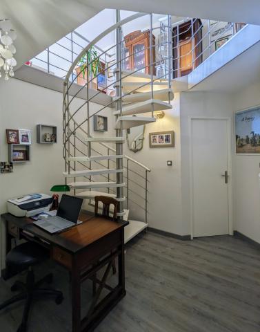 Un escalier hélicoïdal dessert deux chambres, une salle de bain avec douche et sèche-serviettes, un wc indépendant avec lave-mains, une lingerie avec lave-mains également et rangements, et un coin bureau avec grand dressing.