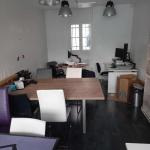Accès aux espaces communs incluant une cuisine équipée avec réfrigérateur, deux micro-ondes et une table conviviale