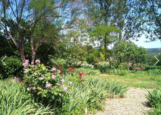 Jardin avec chemin de gravier, banc avec vue sur la vallée et belle fleur.