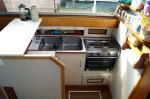 Une cuisine èquipèe ; èvier double bac, frigo, gazinière avec four, rangements.