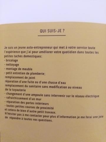 Je suis auto-entrepreneur et je mets à votre service mon savoir-faire pour tous types de bricolage d'intérieur, de nettoyage intérieur ou extérieur et bien d'autres petits travaux domestiques.