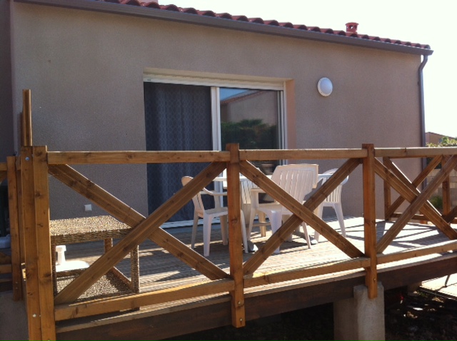 Maison neuve de 50m2 mitoyenne à la notre avec terrasse en bois et BBQ. L'extérieur est spacieux pour voitures et espaces de jeux. Vous avez accés à la piscine. La maison est prevue pour 4 personnes: .1 chambre avec 2 lits simples (90x200)