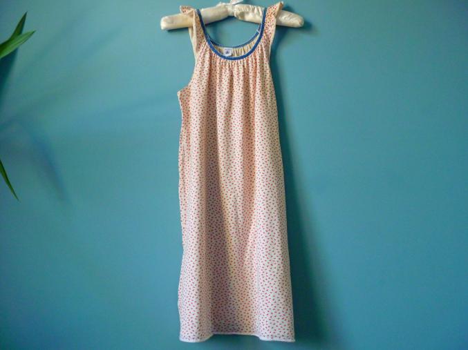 Blanche à motifs 'fleurs rouges', encolure bleue