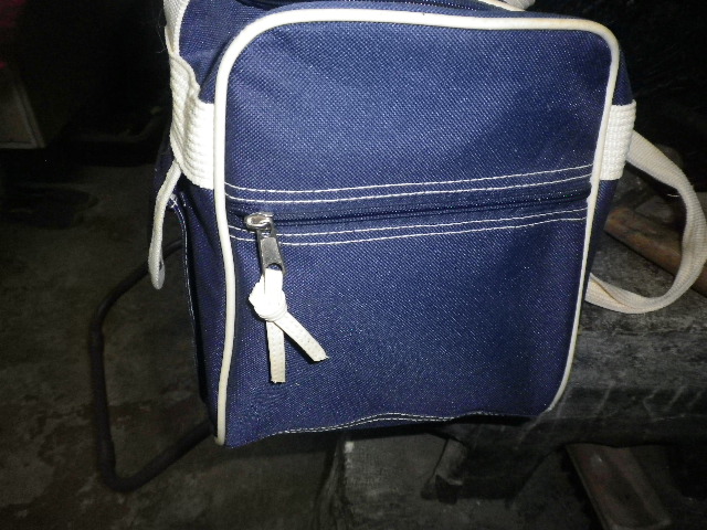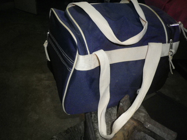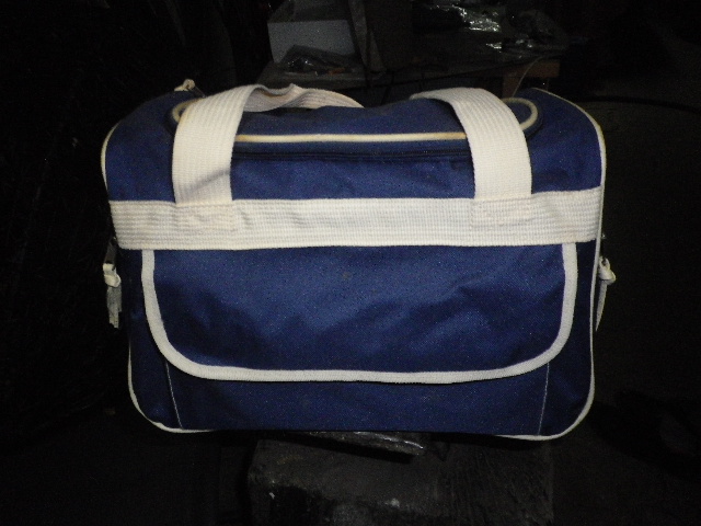 PROPOSE UN SAC BAGUAGE DE VOYAGE DE COULEUR BLEU MARINE AVEC BRETTELES/POIGNEES CRËMES. Dimentions: Hauteur = 240 mm, Base a poser = 200 X 360 mm.