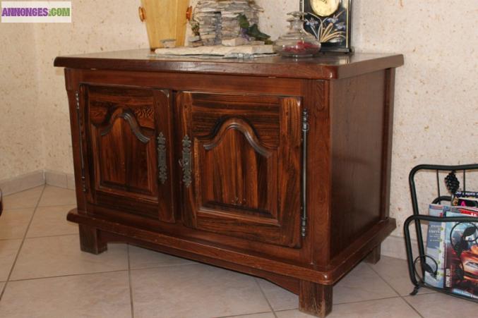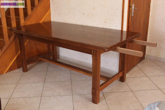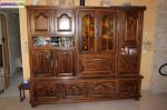 Salle à manger complète en orme, composée d'un grand living(2435 x 550 x 2075), une table(1845 x 895 x 750) avec rallonges(895 x 400), huit chaises, assise en paille et un meuble télé(1060 x 540 x 720)