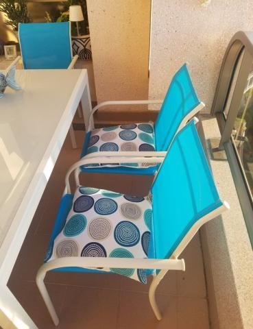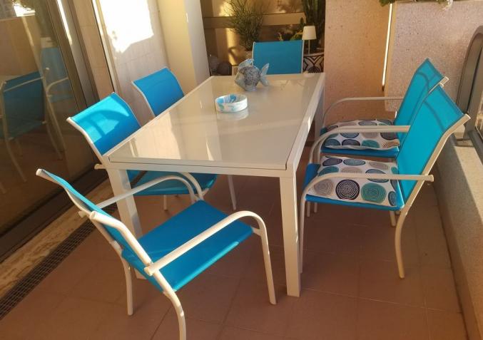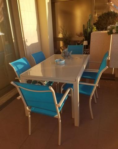 Cause double emploi, très joli salon de jardin blanc et turquoise pratiquement neuf, très fonctionnel, table en verre trempé L 150 cm, P 90 cm, H 74 cm (rallonge intégrées 10 à 12 places) + 6 fauteuils en toile parfaitement empilable pour gain de place.
