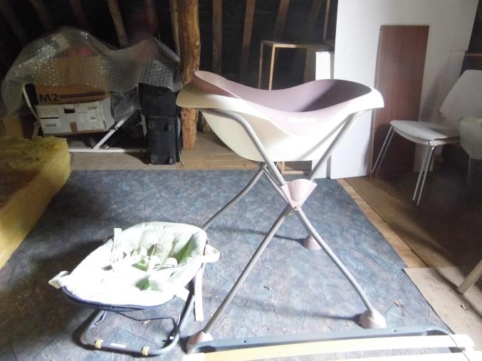 Vends baignoire bébé de marque béaba de couleur blanche et rose/mauve tres pale, avec piétement en fer croisé