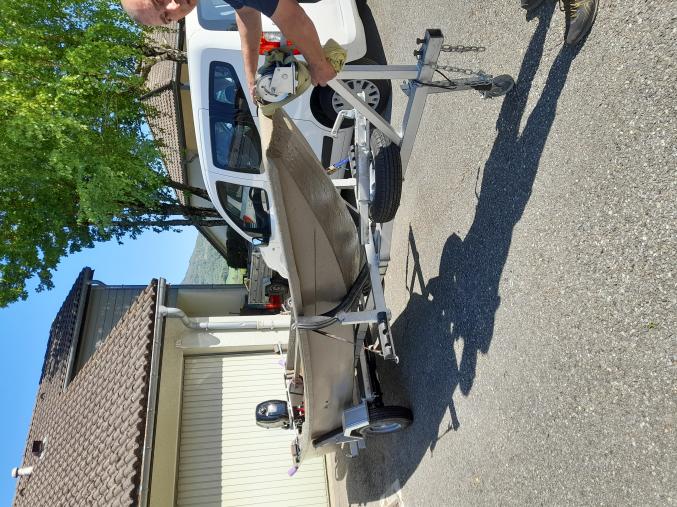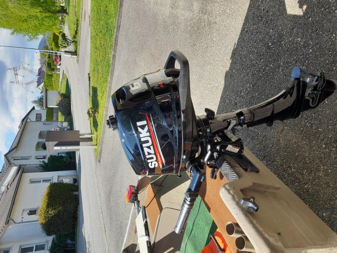 barque de 4.50 fibre de verre styles pirogue avec rame gilets écope ect...+moteurs 6cv 4t neuf Suzuki avec nourrisse 24l +rampe de feux neuf,remorques essieux 4.50x10 + roues de secours neuf timon renforce démontable a débattre